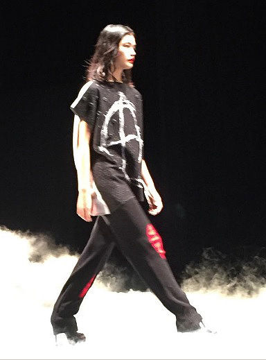 爆音のパンクミュージックが流れるランウェイには、イギリスをイメージさせるチェック柄のアイテムを身にまとったモデルが登場。黒やグレーベースに赤やピンクといったビビッドなカラーリングが目を惹く。スタッズやダメージホール、切り裂かれた様な加工などを施したTシャツやパンツなどは、まさしくイギリスのパンクスタイルを彷彿させるものだ。有刺鉄線や空き缶など無秩序にちりばめられたプリント柄は、2015年のショーから2回目となるロンドン出身のフォトグラファー・Andrew Penkethとのコラボによるデザインで、ストーリーにもある墜落しきった無法地帯を表現している。